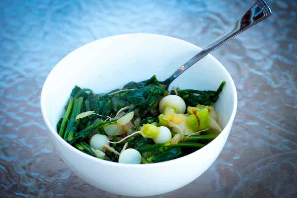 1/2 onion, chopped 1 tsp olive oil 150g baby turnip greens 125ml vegetable or chicken stock 1 tsp Italian seasoning Heat theIngredients