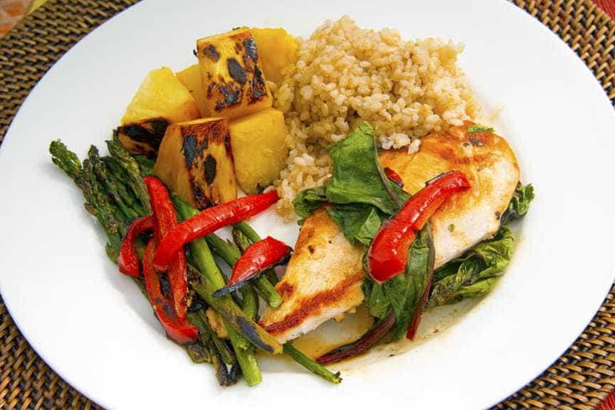 - Arrange the pineapple, peppers, and asparagus around the chicken.