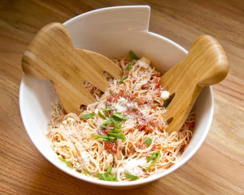 - Roast under the broiler for 10 minutes until skins turn very brown and blisters. Place all vegetables into your food processor or blender. Add fresh basil and puree until smooth. Reheat sauce and serve over cooked linguine pasta. Sprinkle 1 Tbsp grated parmesan and fresh cracked black pepper over the top of each portion.