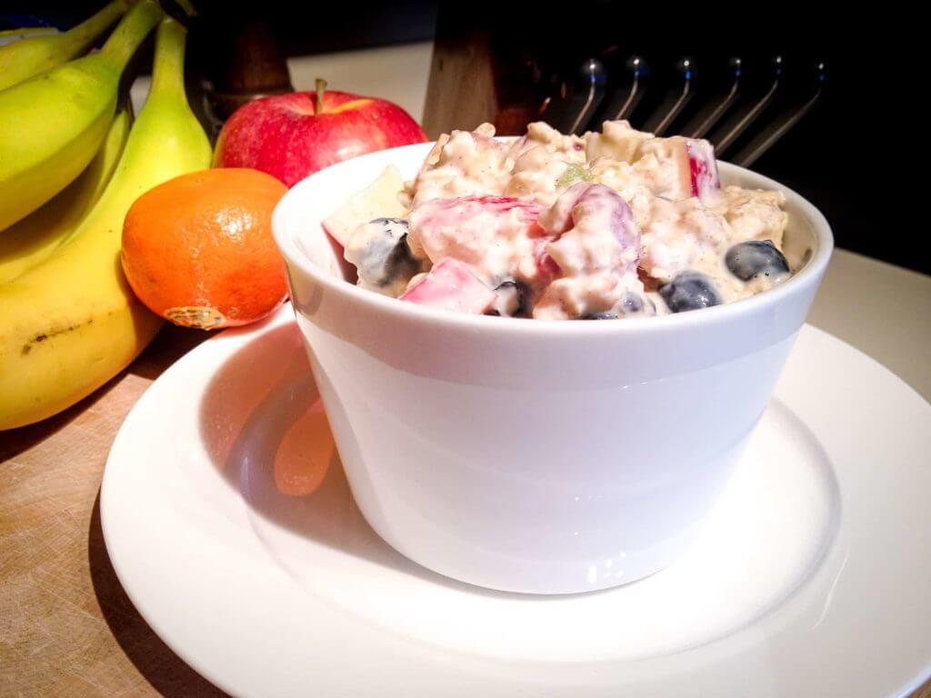 - Mix the rolled oats and skim milk before you prepare the other ingredients. Add the rest of the ingredients and mix well. Eat right away or refrigerate for later.