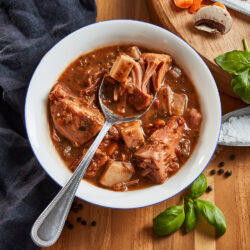 Have a bowl of something warming with our delicious jackfruit stew. Chunky and succulent pieces of jackfruit with potato, celery, carrots and mushrooms in a fragrant, herby sauce – ideal for vegetarians or those who just want a tasty low-calorie meal.