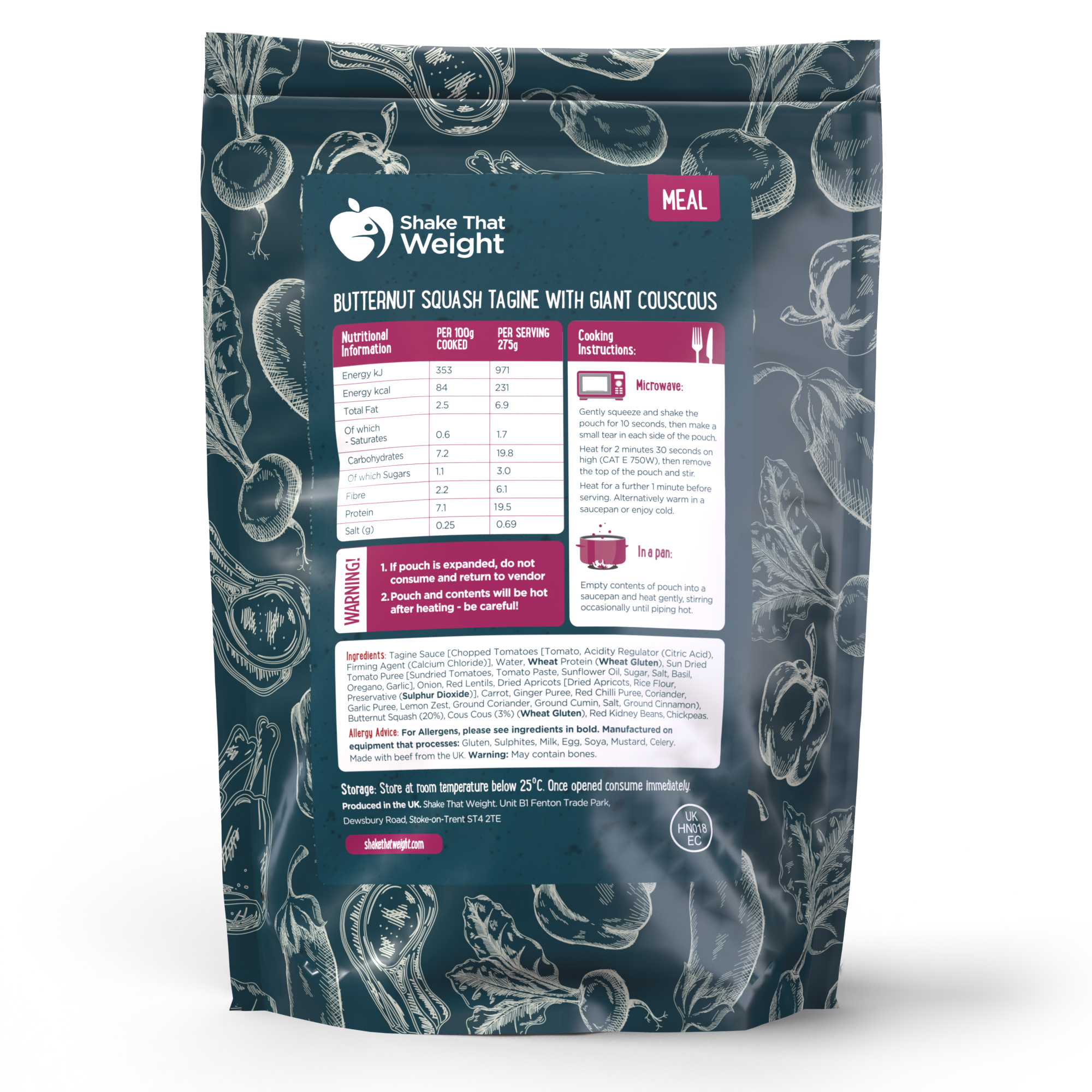 Sauce (69%)(Chopped Tomatoes, Water, Wheat Protein, Sun Dried Tomato Puree, Diced Onion, Red Split Lentils, Diced Apricots (Sulphur Dioxide), Diced Carrot, Ginger, Red Chilli, Chopped Coriander, Garlic, Lemon Zest, Ground Coriander, Cumin (Gluten), Salt, Cinnamon), Butternut Squash (20%), Couscous (3%)(Wheat Gluten), Chickpeas (3%), Red Kidney Beans (3%).