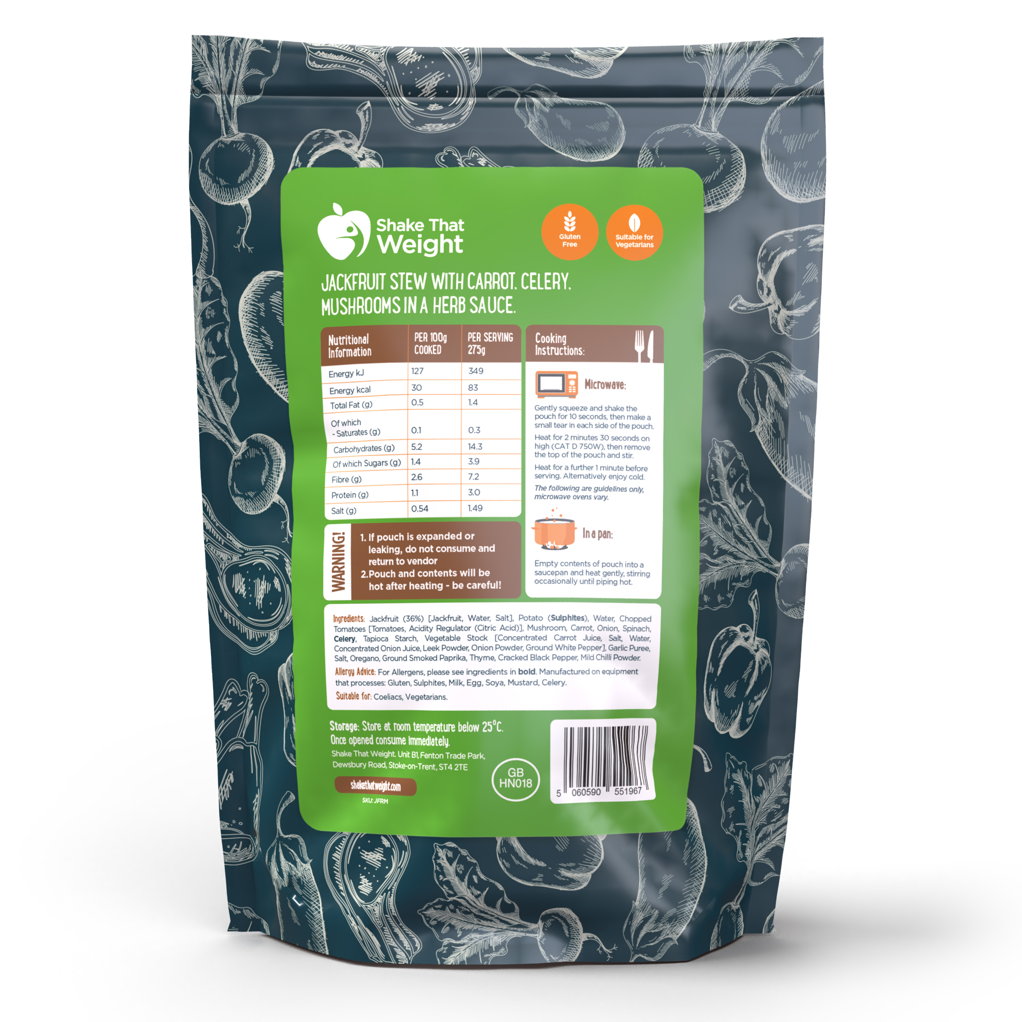 Jackfruit (36%) [Jackfruit, Water, Salt], Potato (Sulphites), Water, Chopped Tomatoes [Tomatoes, Acidity Regulator (Citric Acid)], Mushroom, Carrot, Onion, Spinach, Celery, Tapioca Starch, Vegetable Stock [Concentrated Carrot Juice, Salt, Water, Concentrated Onion Juice, Leek Powder, Onion Powder, Ground White Pepper], Garlic Puree, Salt, Oregano, Ground Smoked Paprika, Thyme, Cracked Black Pepper, Mild Chilli Powder.